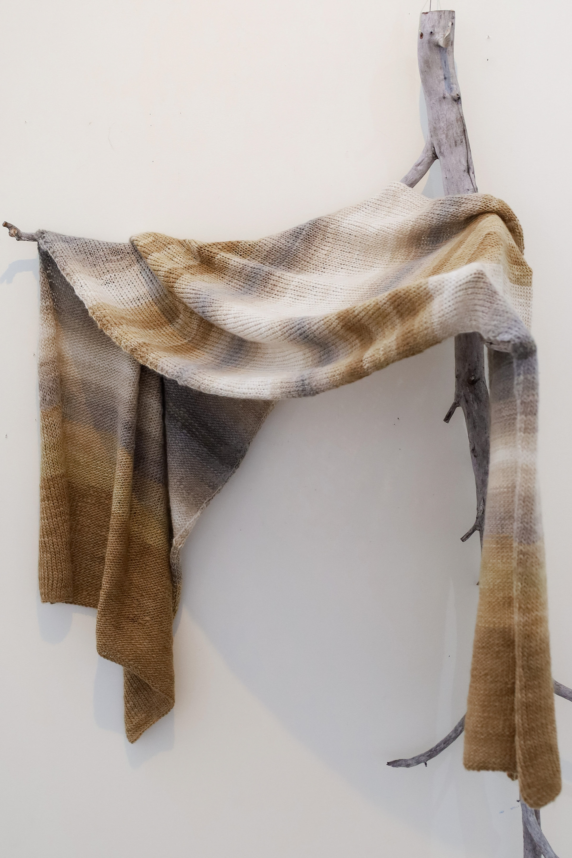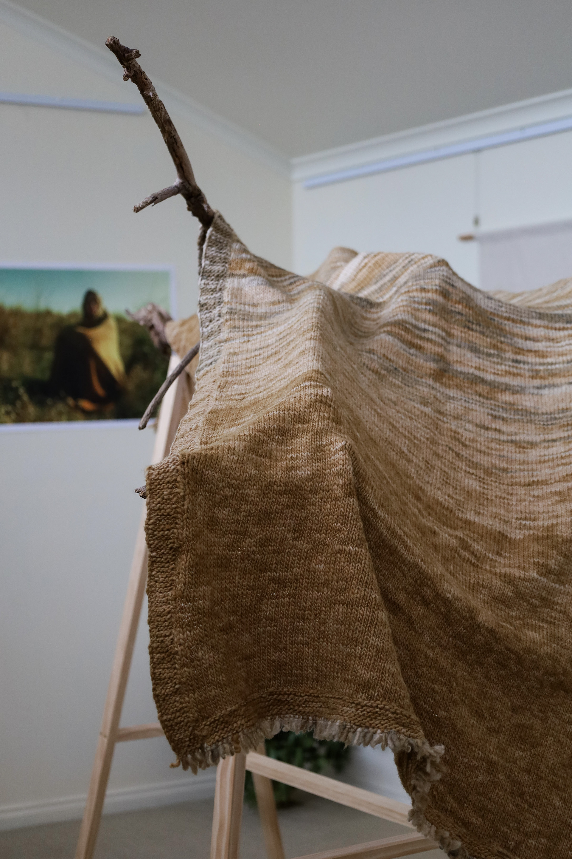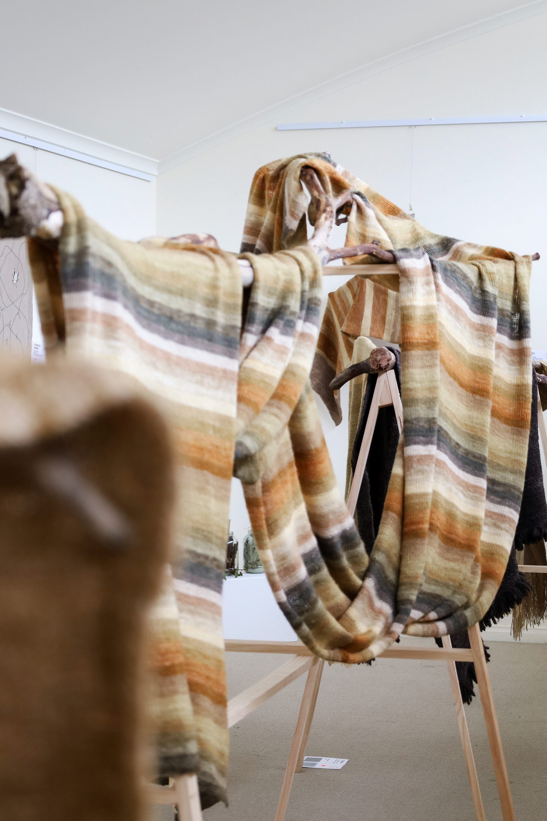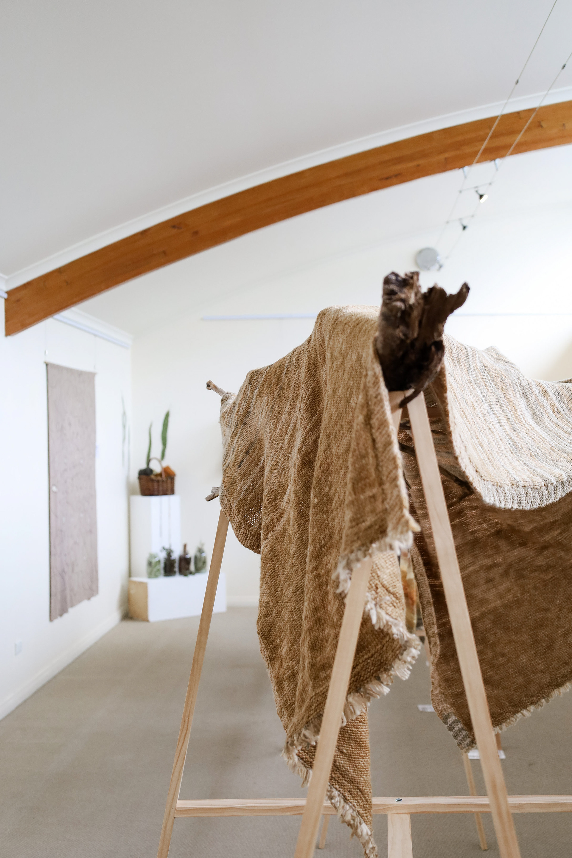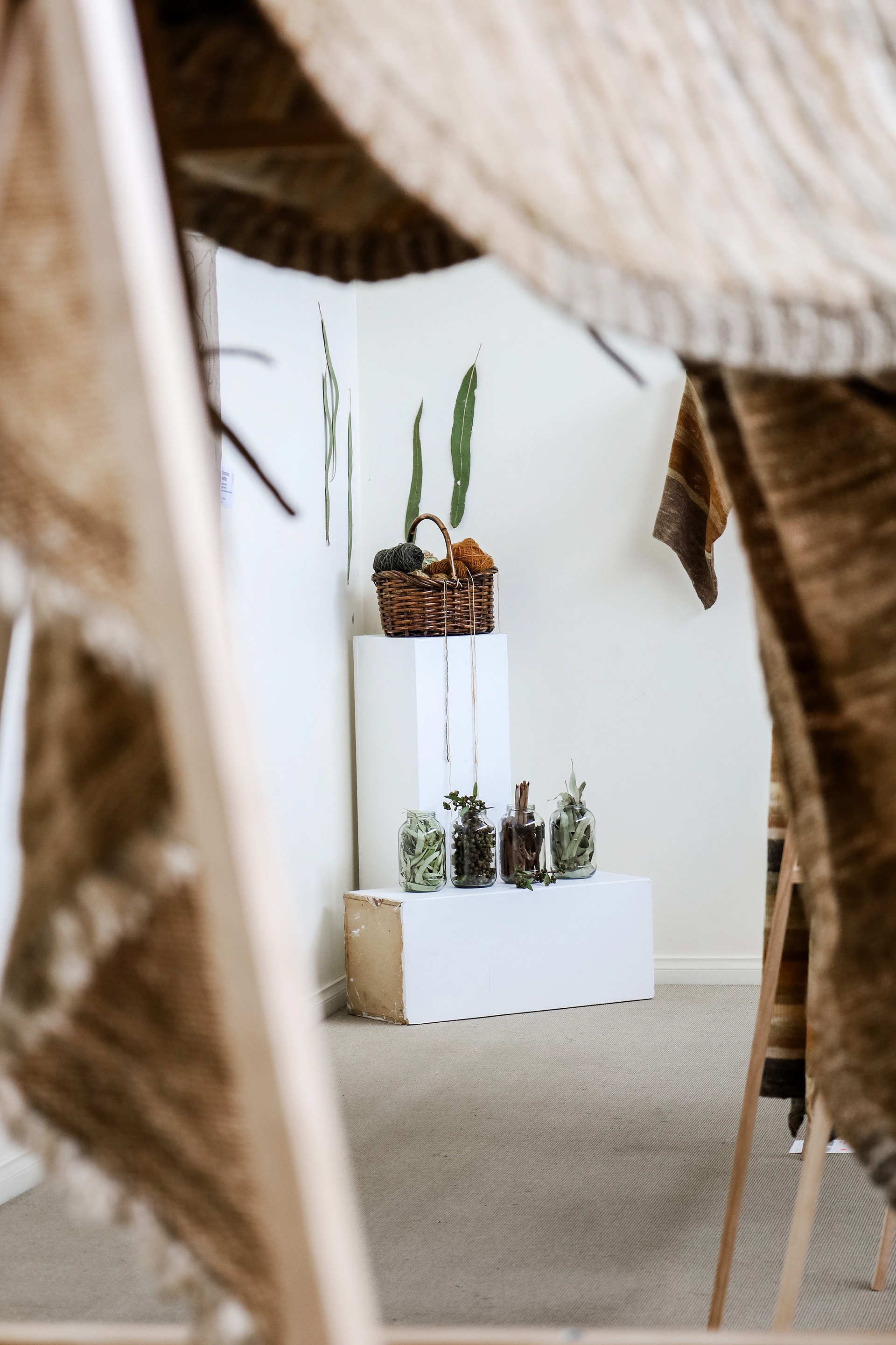 “This exhibition is a result of my learning and research project about wool and gum tree dyes and although it started as an exploration of wool, natural dyes and textiles in particular, it has lead me down a path of connecting with the environment and land and feeling more at home where I am. A significant element of the project has been the condition that the central wool pieces are created using one animal as a source of wool, one plant as a source of dye and one person as the maker of the pieces, following through the whole process of washing, carding, spinning, dyeing, knitting, weaving of the item. In a way each piece is also a data visualisation project, where each piece is made out of an entire fleece and the colour variations are achieved by using only one source, that has been manipulated using variables such as time and mordant. Additionally to the knitted and woven pieces, I have utilised the natural dyes to colour other tapestries and household pieces, such as table cloths, bags and curtains that are hand screenprinted and embroidered.”
