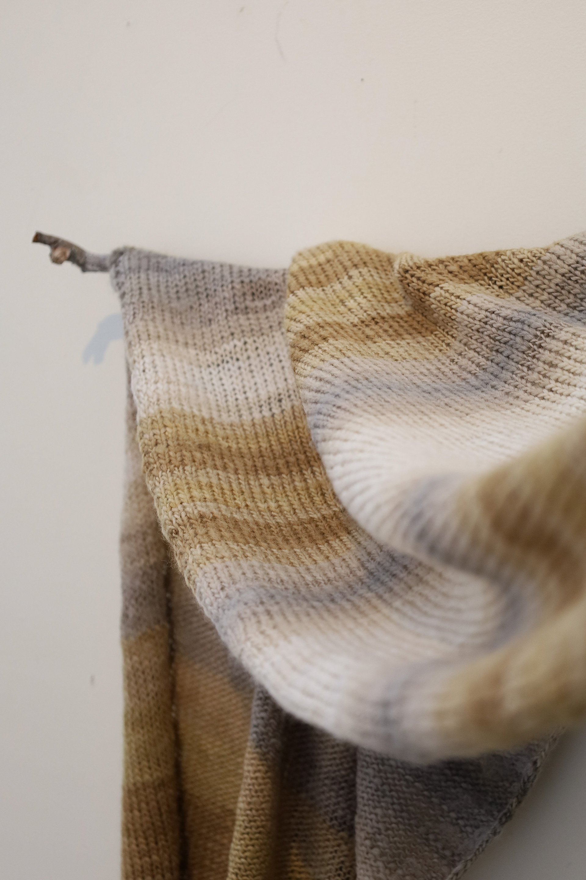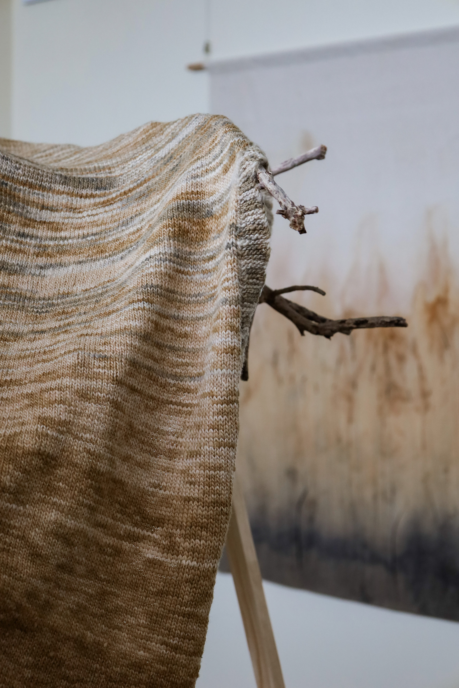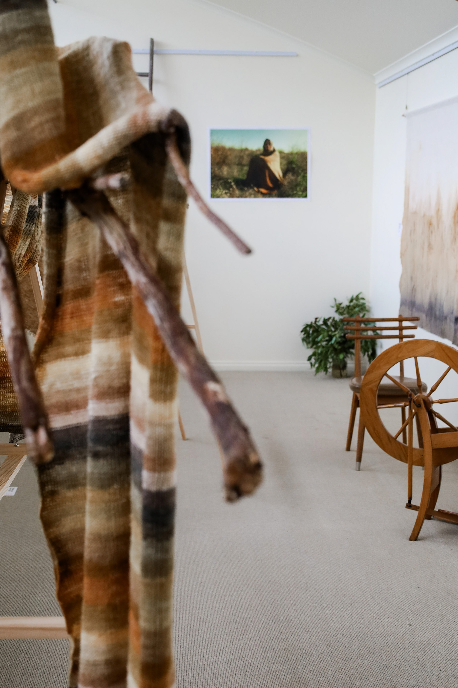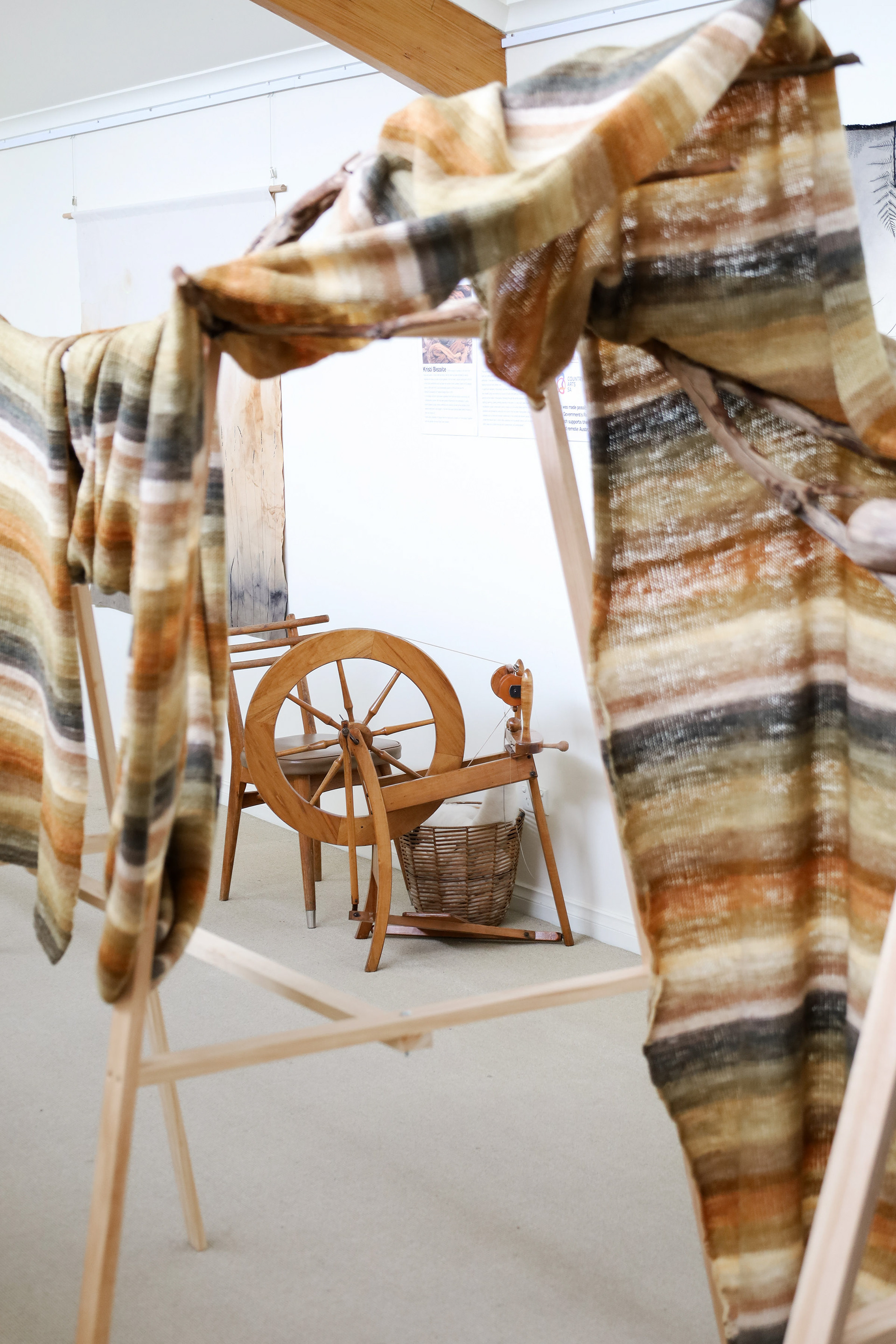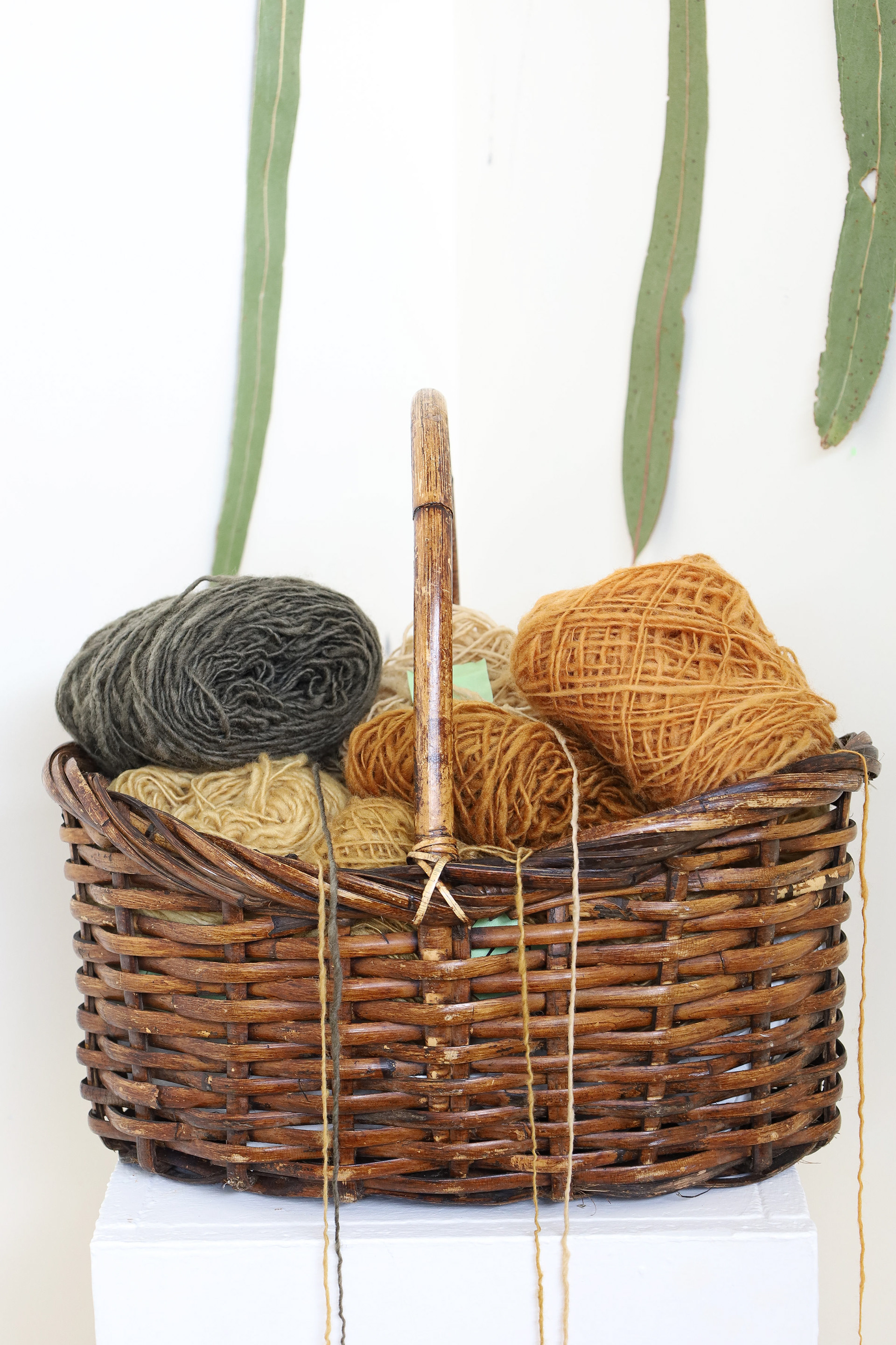 “This exhibition is a result of my learning and research project about wool and gum tree dyes and although it started as an exploration of wool, natural dyes and textiles in particular, it has lead me down a path of connecting with the environment and land and feeling more at home where I am. A significant element of the project has been the condition that the central wool pieces are created using one animal as a source of wool, one plant as a source of dye and one person as the maker of the pieces, following through the whole process of washing, carding, spinning, dyeing, knitting, weaving of the item. In a way each piece is also a data visualisation project, where each piece is made out of an entire fleece and the colour variations are achieved by using only one source, that has been manipulated using variables such as time and mordant. Additionally to the knitted and woven pieces, I have utilised the natural dyes to colour other tapestries and household pieces, such as table cloths, bags and curtains that are hand screenprinted and embroidered.”