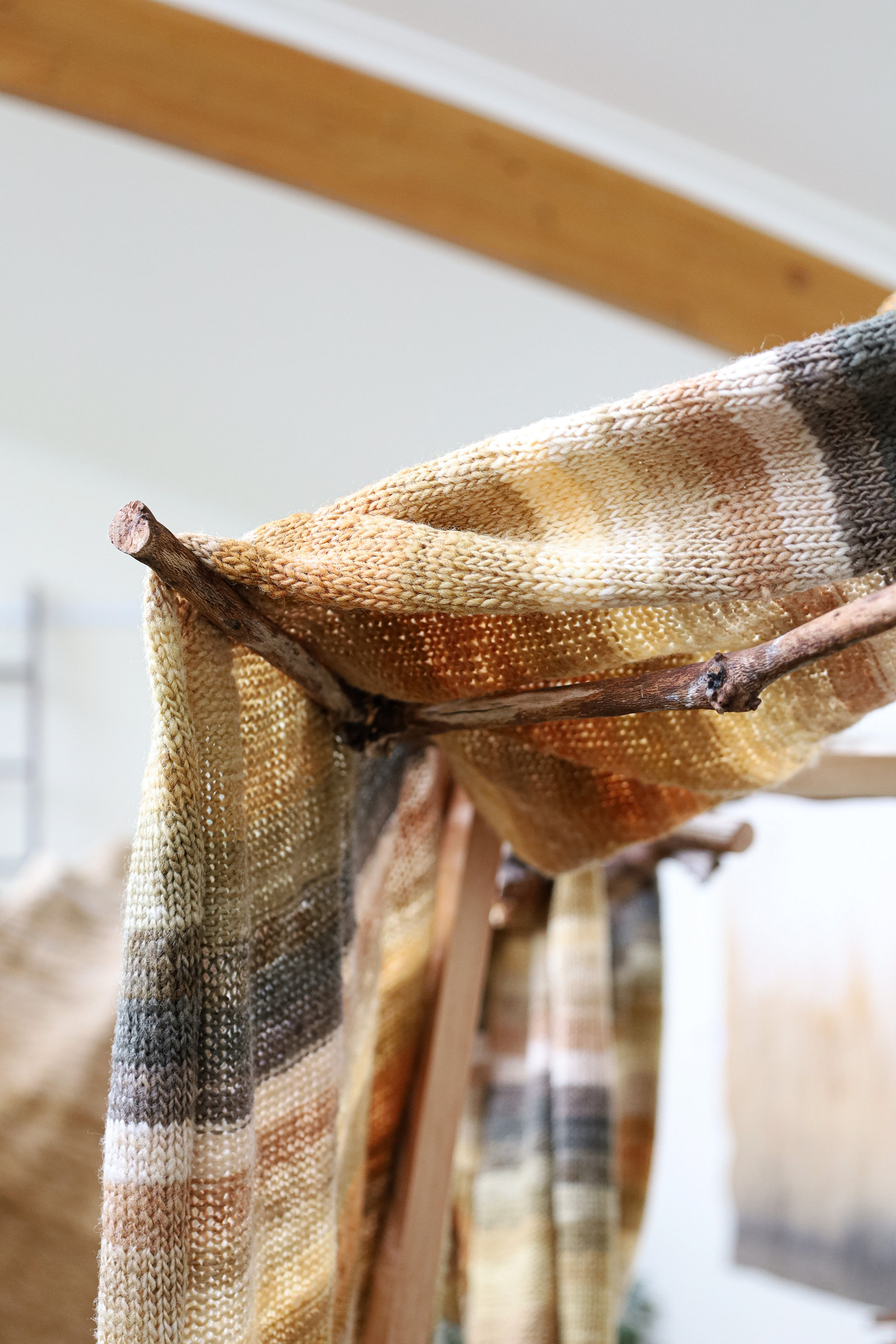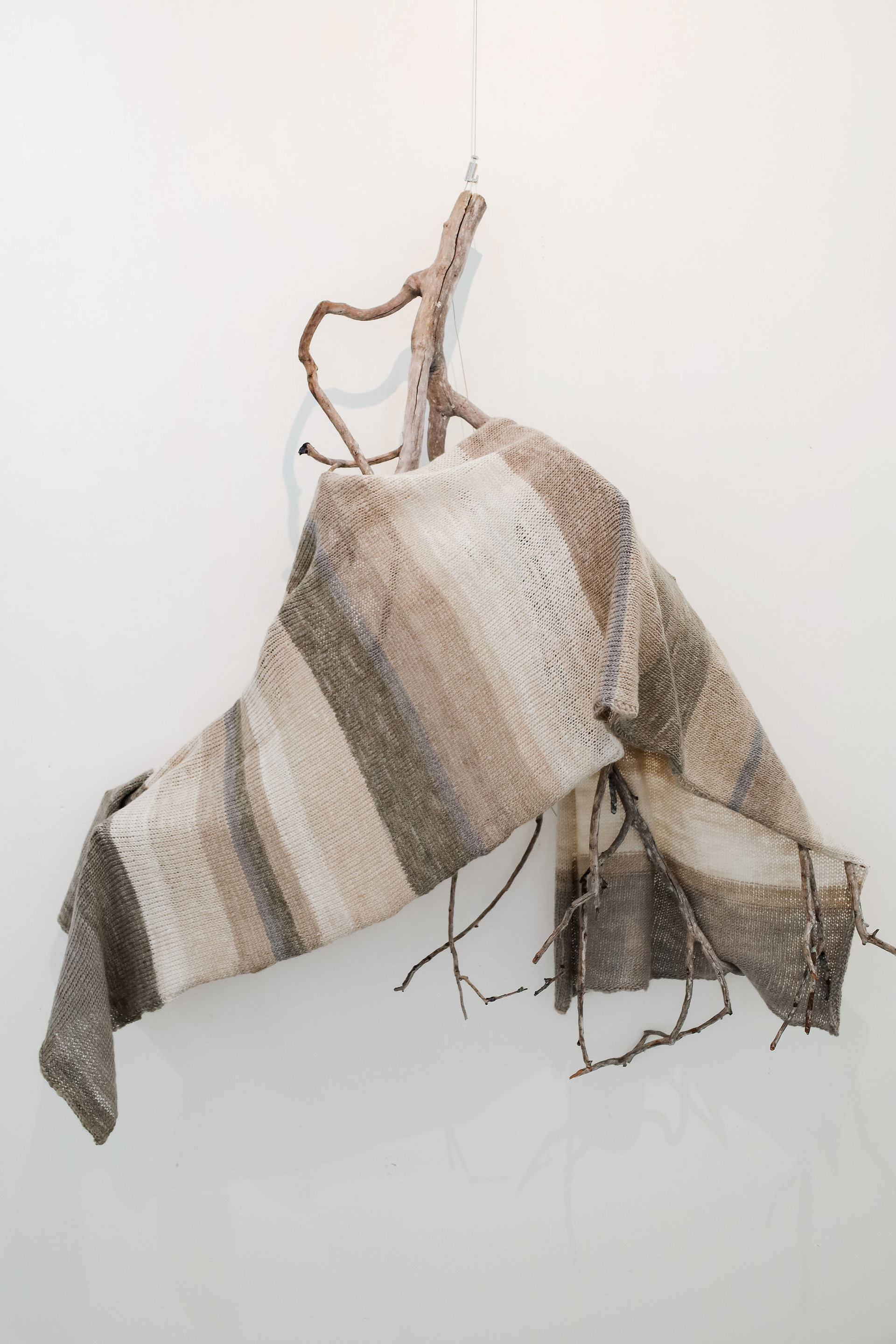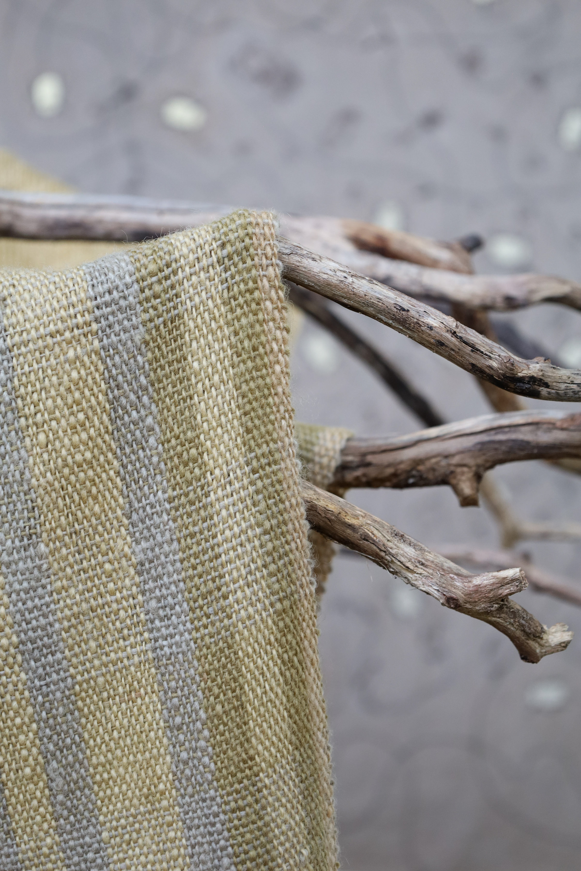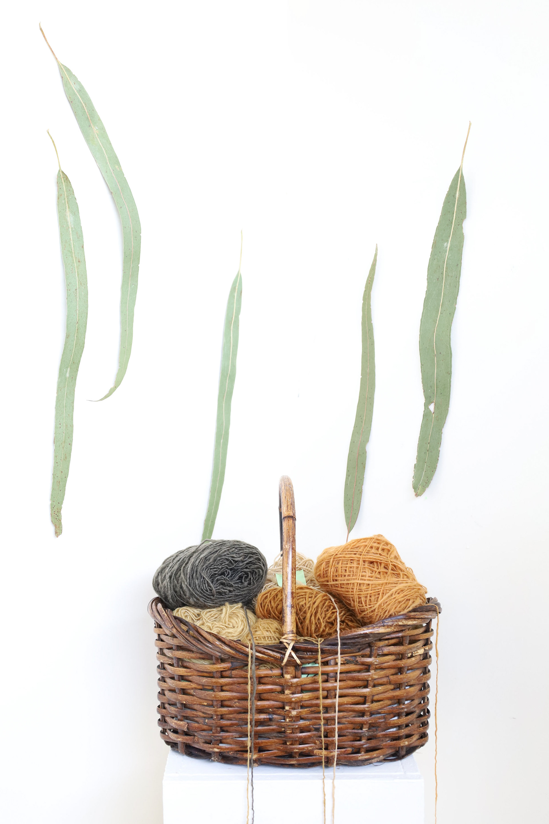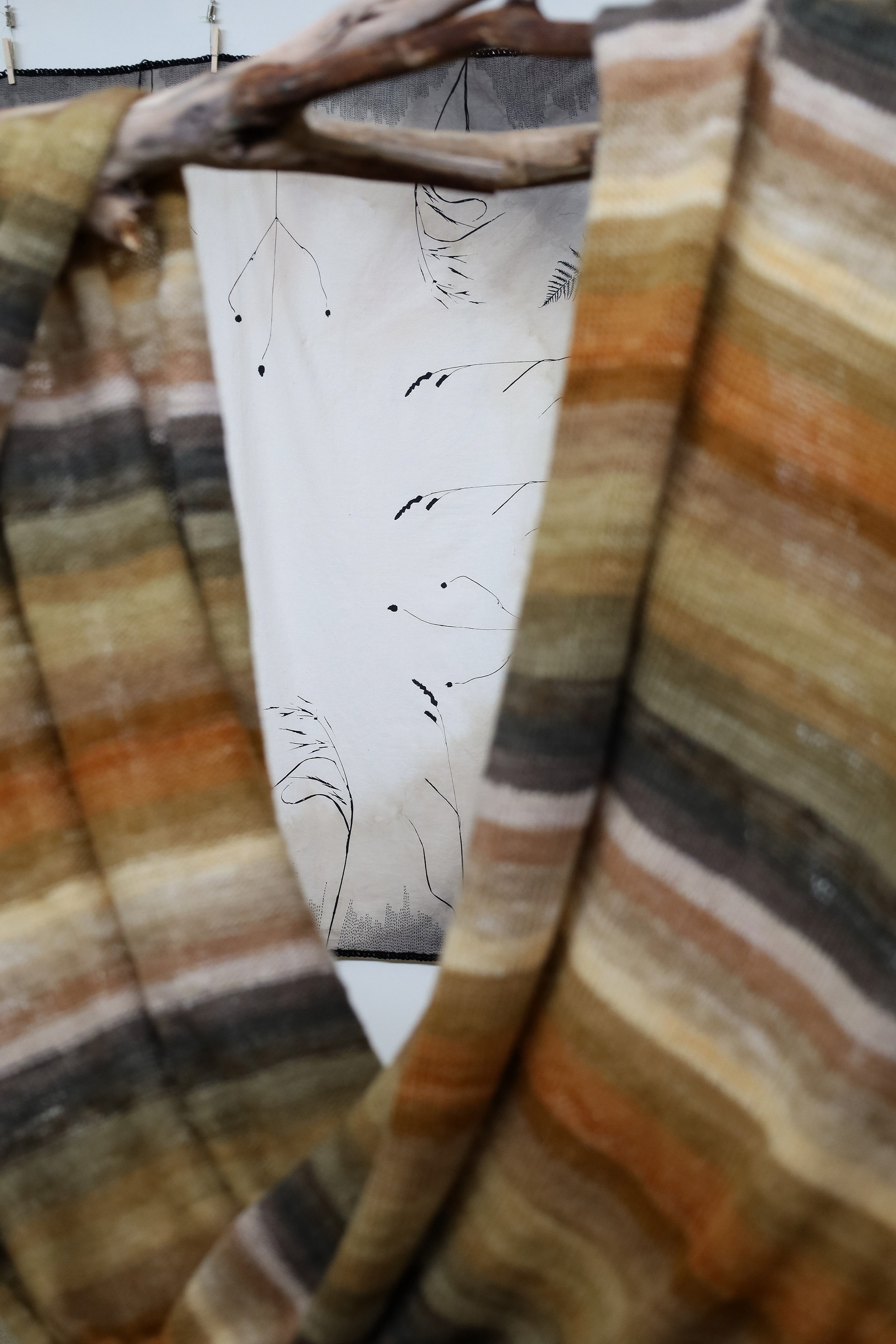 “This exhibition is a result of my learning and research project about wool and gum tree dyes and although it started as an exploration of wool, natural dyes and textiles in particular, it has lead me down a path of connecting with the environment and land and feeling more at home where I am. A significant element of the project has been the condition that the central wool pieces are created using one animal as a source of wool, one plant as a source of dye and one person as the maker of the pieces, following through the whole process of washing, carding, spinning, dyeing, knitting, weaving of the item. In a way each piece is also a data visualisation project, where each piece is made out of an entire fleece and the colour variations are achieved by using only one source, that has been manipulated using variables such as time and mordant. Additionally to the knitted and woven pieces, I have utilised the natural dyes to colour other tapestries and household pieces, such as table cloths, bags and curtains that are hand screenprinted and embroidered.”