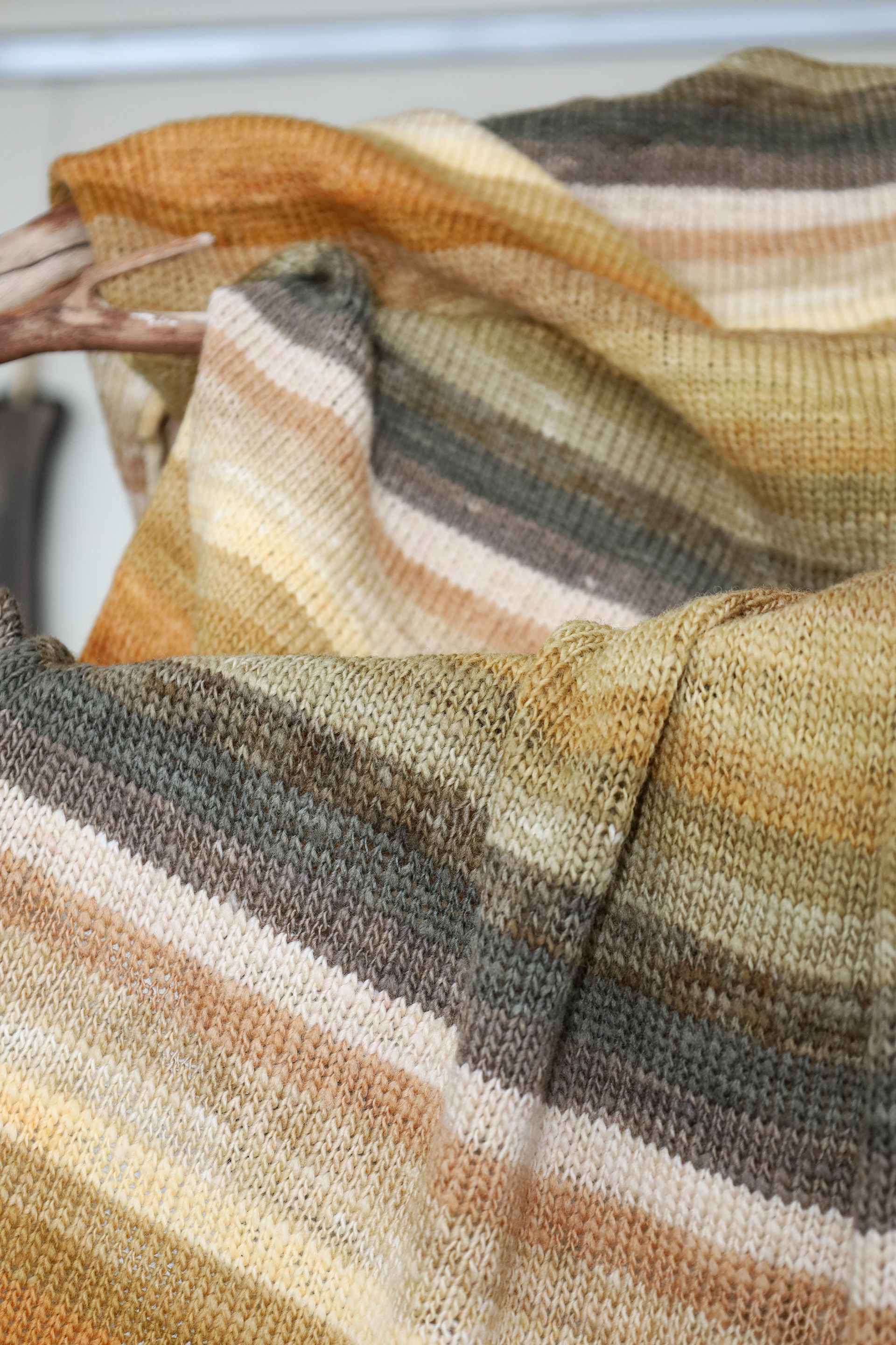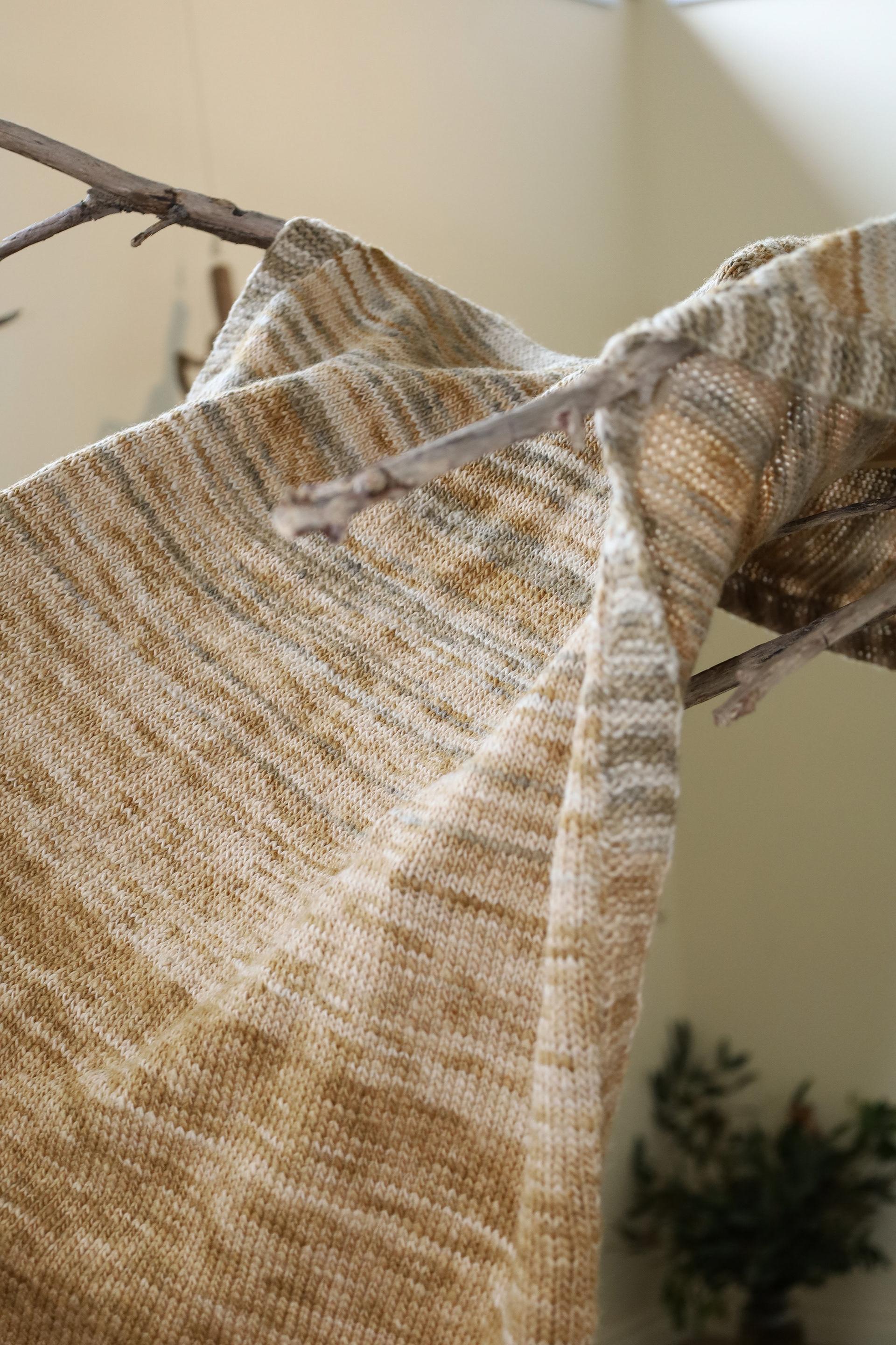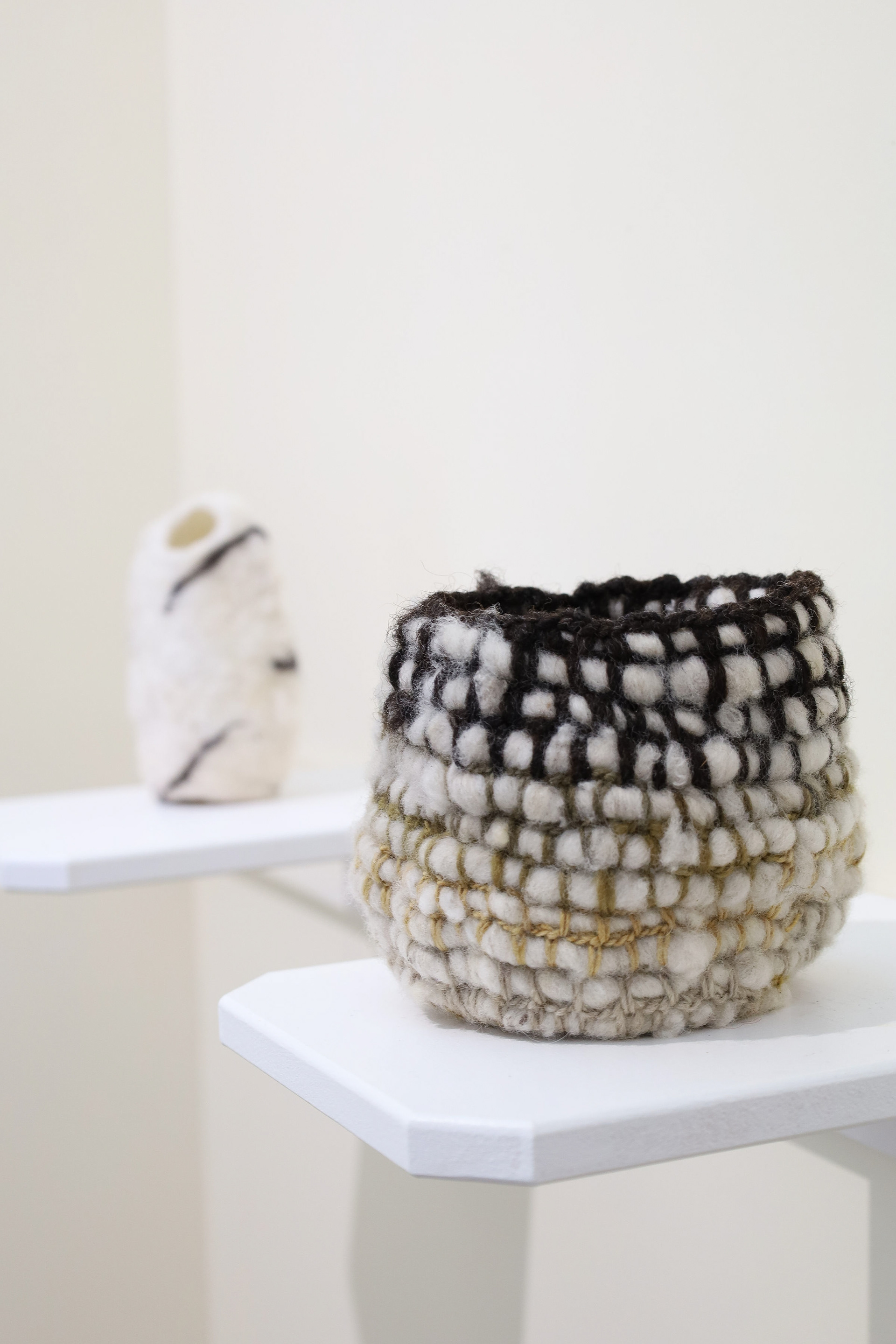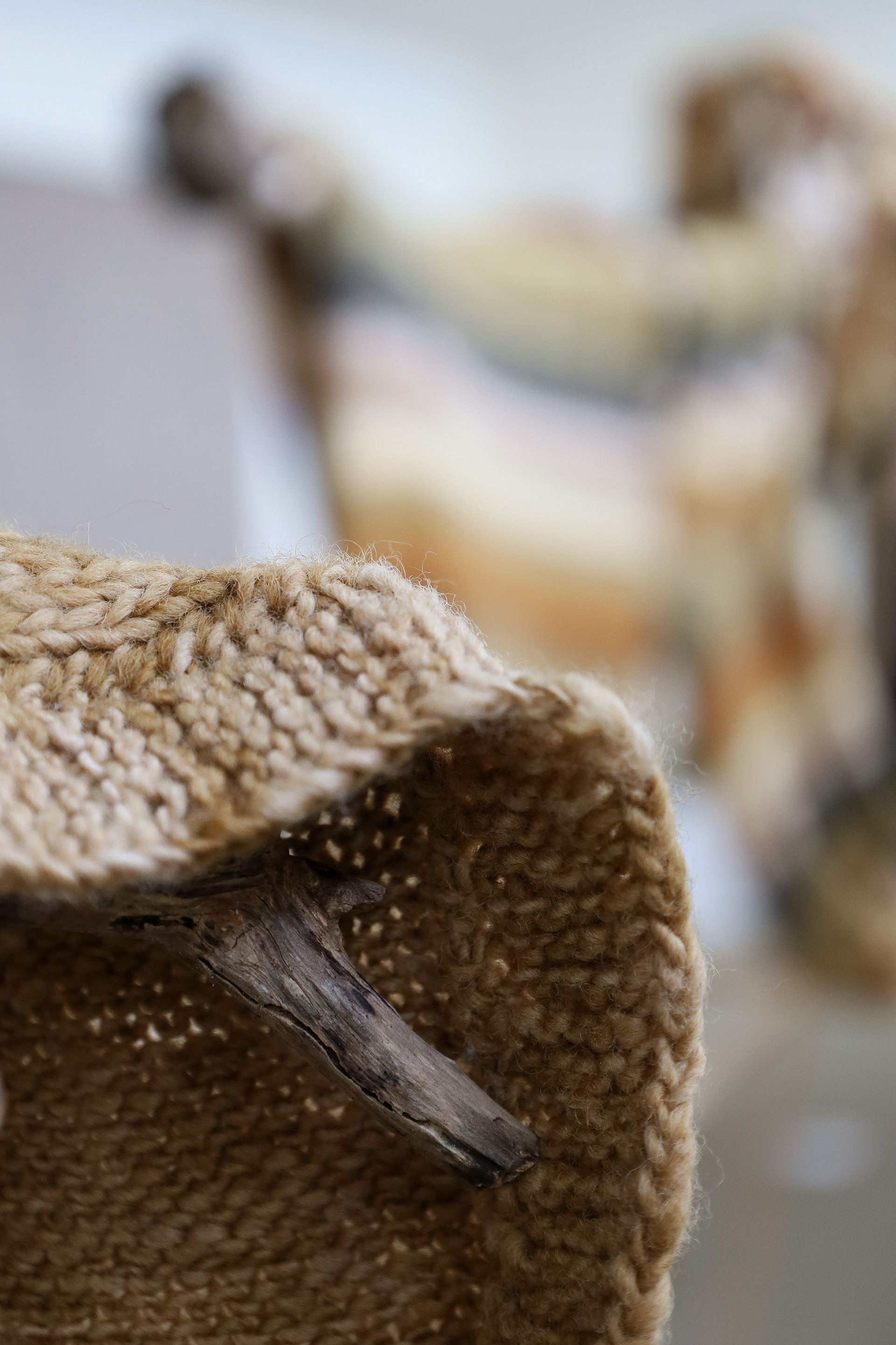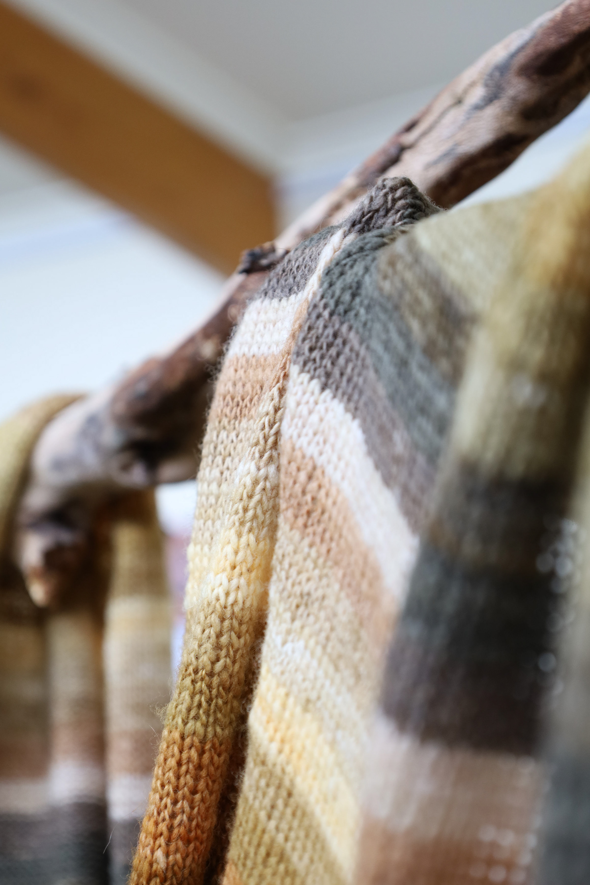 “This exhibition is a result of my learning and research project about wool and gum tree dyes and although it started as an exploration of wool, natural dyes and textiles in particular, it has lead me down a path of connecting with the environment and land and feeling more at home where I am. A significant element of the project has been the condition that the central wool pieces are created using one animal as a source of wool, one plant as a source of dye and one person as the maker of the pieces, following through the whole process of washing, carding, spinning, dyeing, knitting, weaving of the item. In a way each piece is also a data visualisation project, where each piece is made out of an entire fleece and the colour variations are achieved by using only one source, that has been manipulated using variables such as time and mordant. Additionally to the knitted and woven pieces, I have utilised the natural dyes to colour other tapestries and household pieces, such as table cloths, bags and curtains that are hand screenprinted and embroidered.”