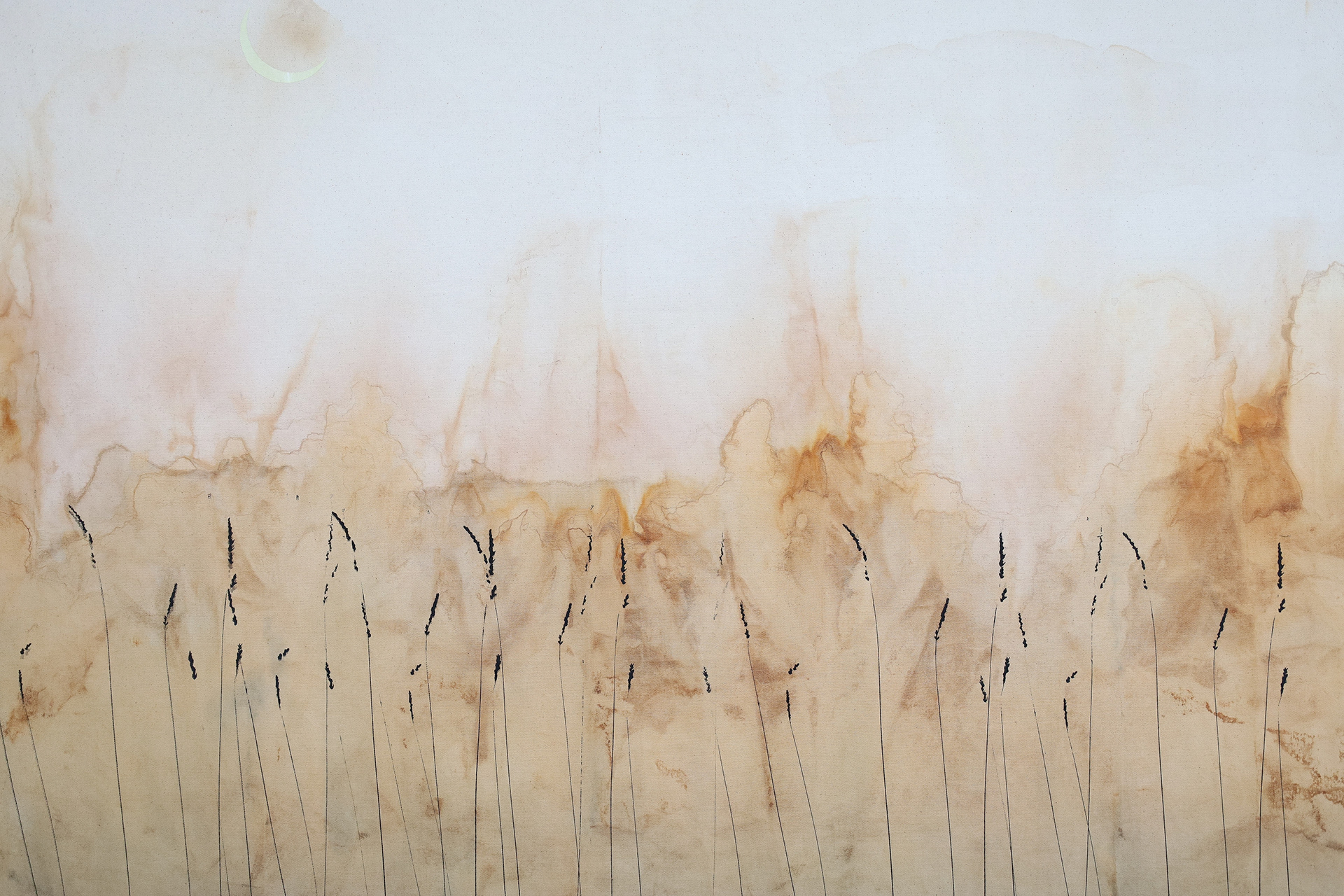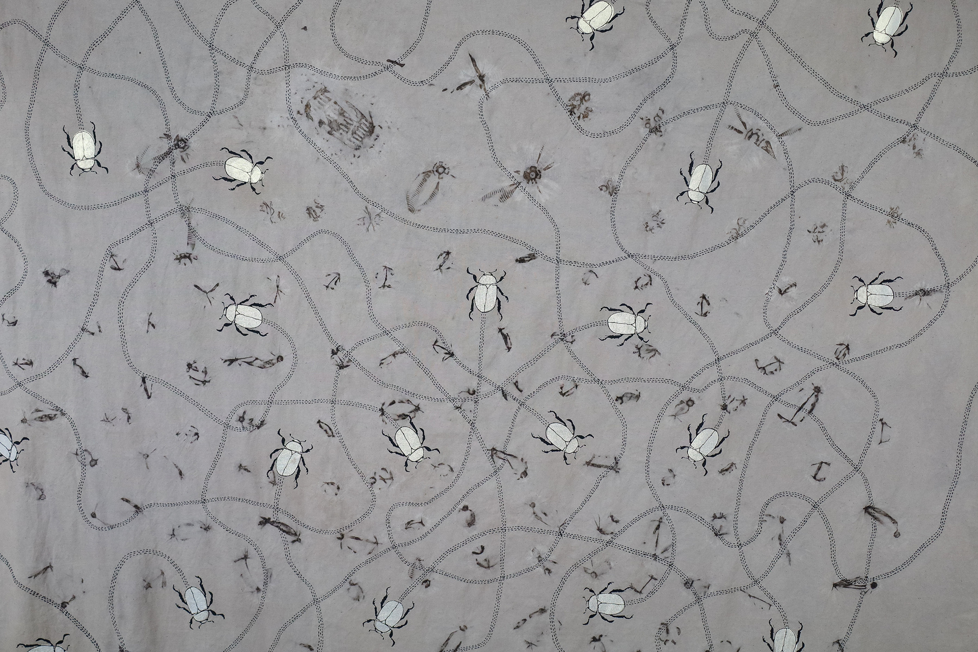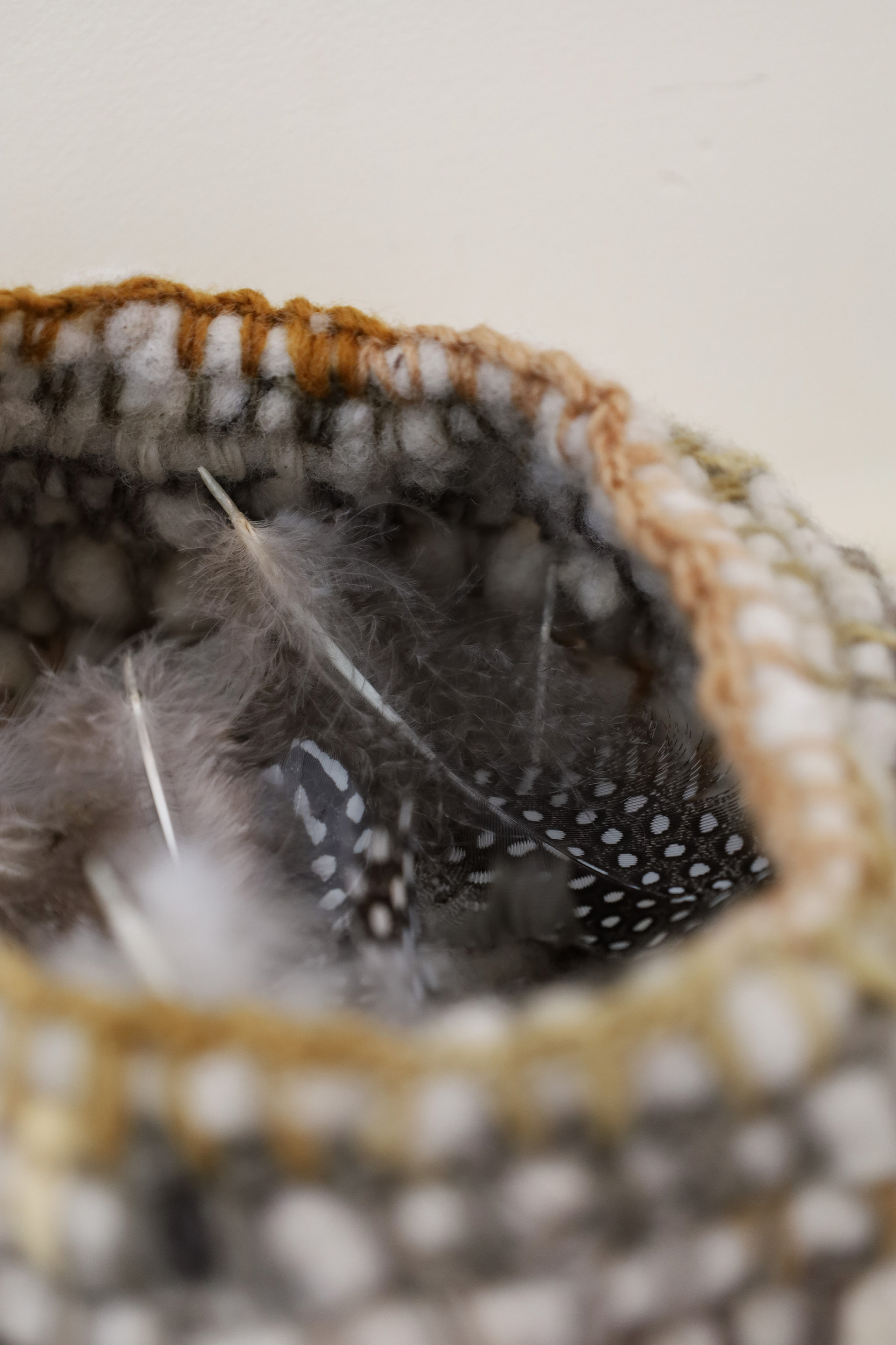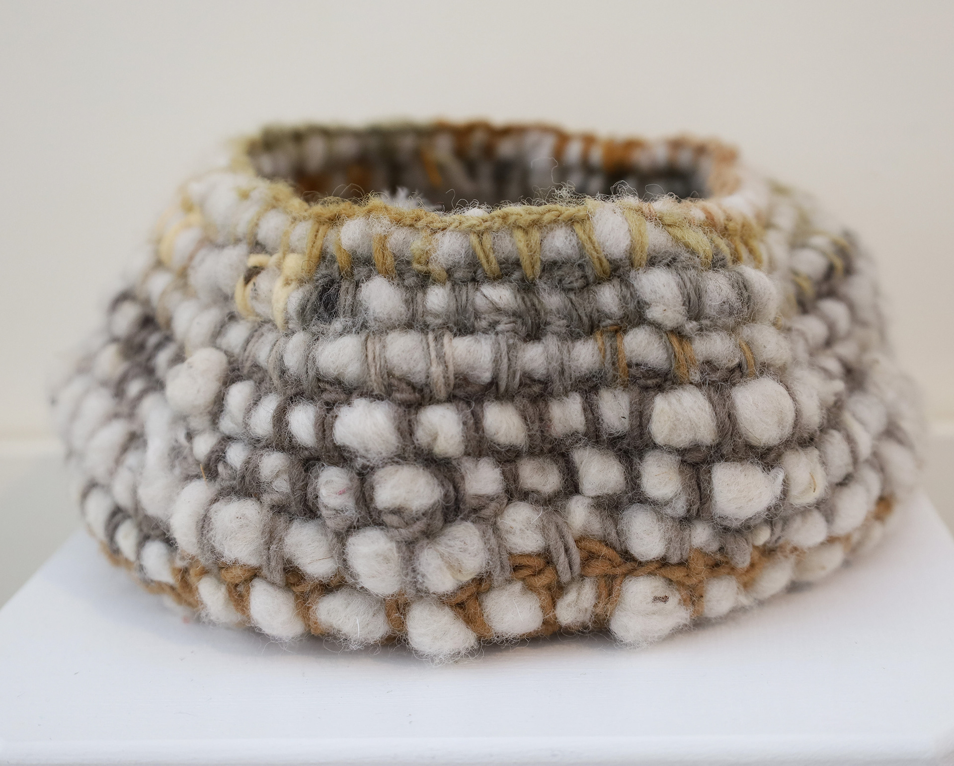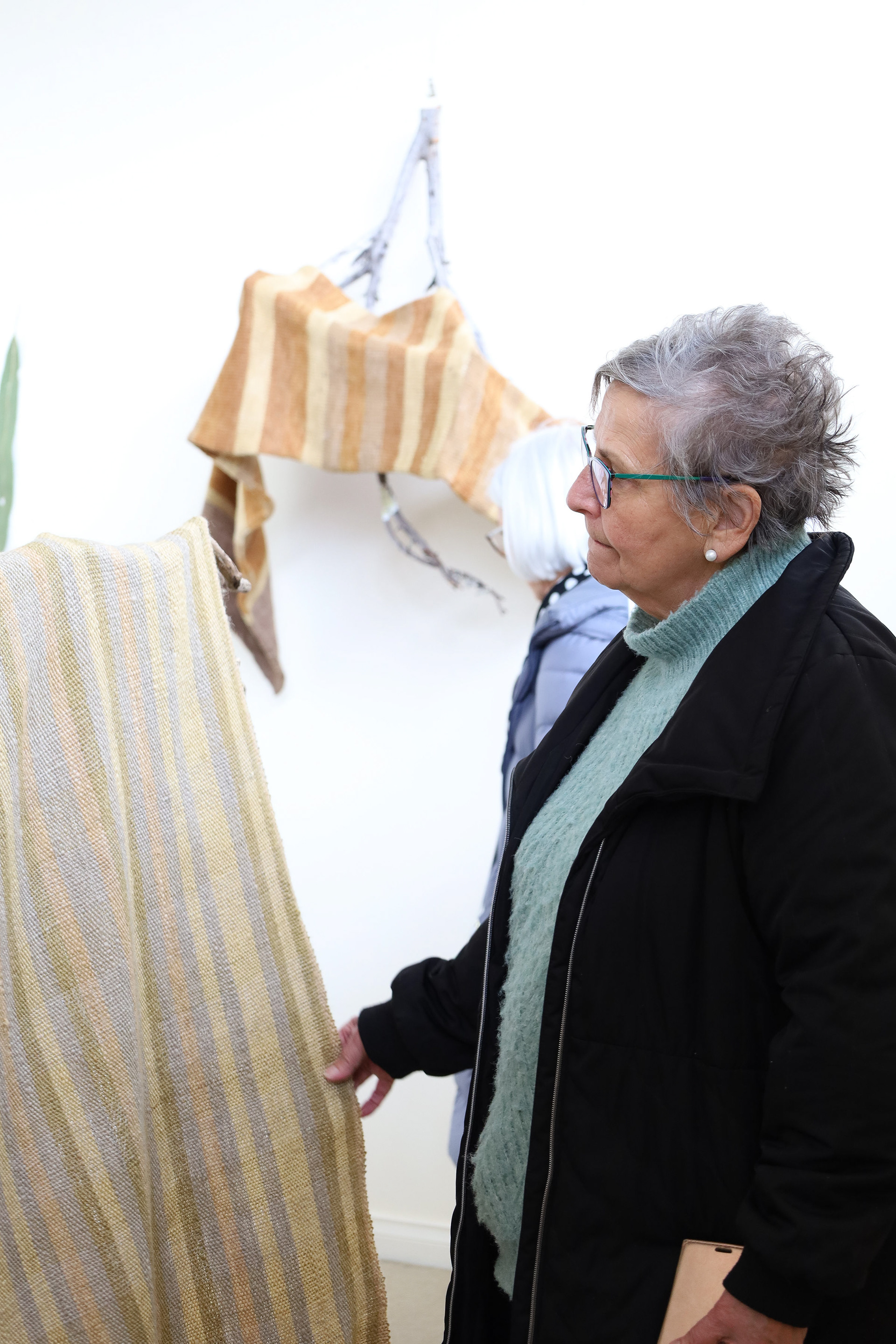 “This exhibition is a result of my learning and research project about wool and gum tree dyes and although it started as an exploration of wool, natural dyes and textiles in particular, it has lead me down a path of connecting with the environment and land and feeling more at home where I am. A significant element of the project has been the condition that the central wool pieces are created using one animal as a source of wool, one plant as a source of dye and one person as the maker of the pieces, following through the whole process of washing, carding, spinning, dyeing, knitting, weaving of the item. In a way each piece is also a data visualisation project, where each piece is made out of an entire fleece and the colour variations are achieved by using only one source, that has been manipulated using variables such as time and mordant. Additionally to the knitted and woven pieces, I have utilised the natural dyes to colour other tapestries and household pieces, such as table cloths, bags and curtains that are hand screenprinted and embroidered.”